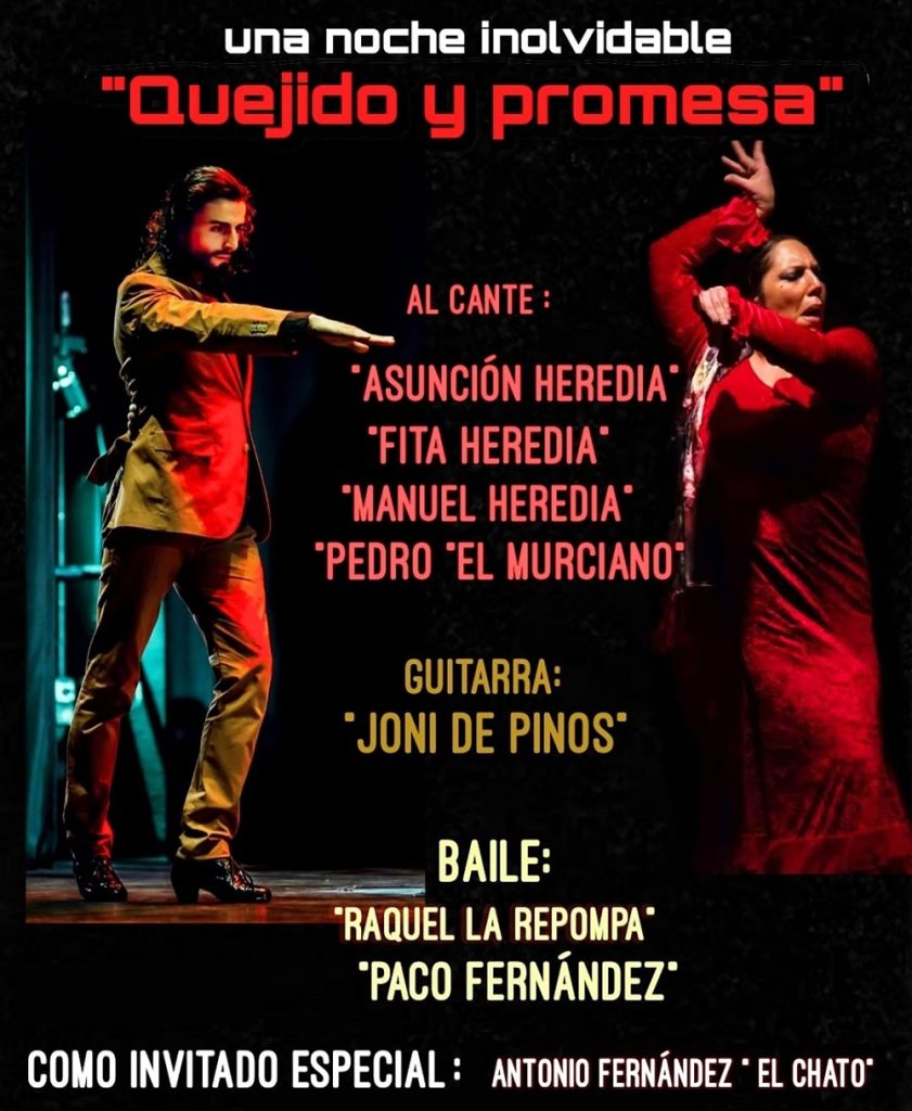 Velada inolvidable de flamenco con el cante de Asunción Heredia, Fita Heredia y Manuel Heredia. Completan el elenco la guitarra de Joni de Pinos y el baile de Raquel La Repompa y Paco Fernández, con Antonio Fernández El Chato como invitado especial.