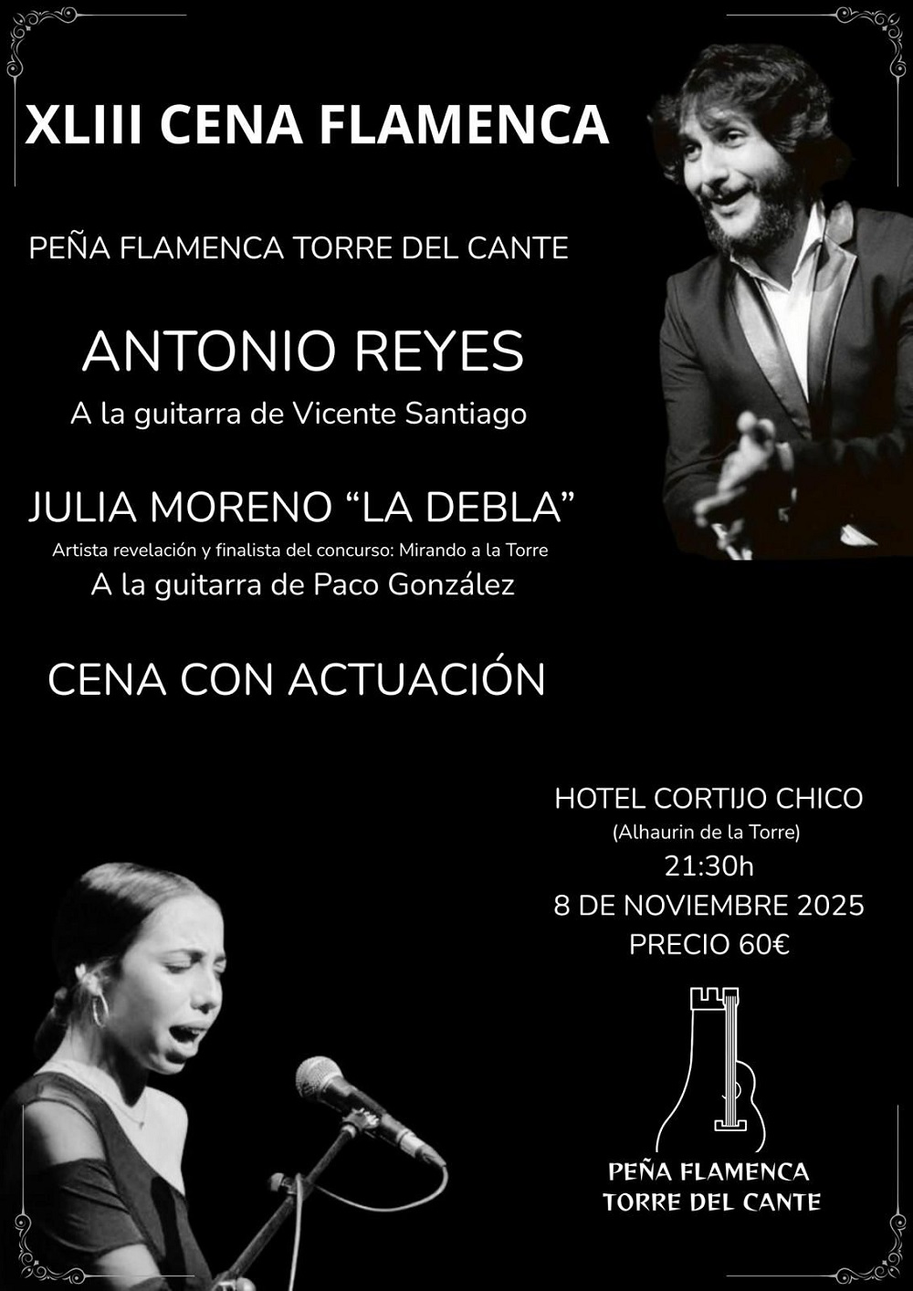 Hotel Cortijo Chico Av. las Americas s/n, Alhaurín de la Torre, MálagaPeña Flamenca Torre del Cante. Antonio Reyes. A la guitarra Vicente Santiago. Julia Moreno "La Debla". A la guitarra Paco González. Puede compartir este evento en: